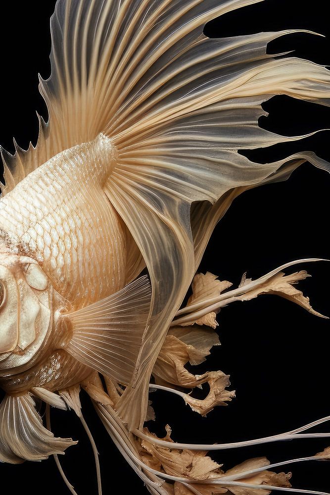 Een vis zweeft als stilleven, haar abstracte vinnen golvend in een diepe, donkere achtergrond. Een elegante sfeer omringt haar, een sjieke compositie van kleuren en vormen. De contouren van haar gestalte zijn als kunst, een mysterieus ballet van schitterende schubben. Het tafereel ademt verfijning uit, haar aanwezigheid vastgelegd in een tijdloze dans van contrasten. De vis lijkt te zweven, een gracieuze verschijning in een wereld van donker fluweel. Elk detail is doordacht en zorgvuldig gearrangeerd, waardoor het schilderij een aura van ingetogen schoonheid uitstraalt, verankerd in de stilte van haar onderwaterrijk.