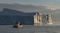 Een vissersboot in de baai van Discobay in Groenland. Foto genomen rond middernacht, met een lage zon aan de horizon. In de achtergrond een immense ijsberg.