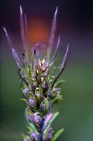 Deze fascinerende macro-opname legt het magische moment vast waarop een bloemtak zich in adembenemend detail ontvouwt. De tere, paarsgroene bloemknoppen lijken zich langzaam los te maken uit hun omhulsel, terwijl fijne haartjes als voelsprieten in het licht steken. Op de achtergrond gloeit een intens warmoranje lichtbron als een…