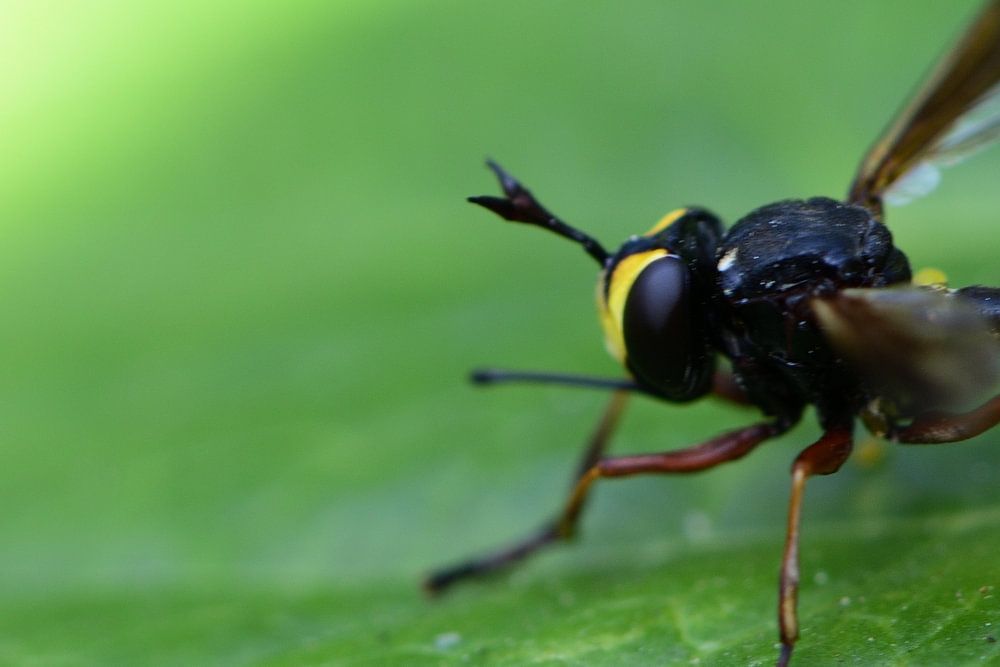 Ik heb deze foto gemaakt in de achtertuin waar deze vlieg op een blad zat. Ik weet niet om wat voor een vlieg het gaat, ik vond het wel de moeite waart om een foto te maken. Om deze foto te kunnen maken heb ik een macrolens gebruikt, het is wel meer een close-up dan een macro. De blad waar deze insect op zit is van een hortensia. Toen ik deze foto maakte zat deze vlieg in de schaduw. Ik heb wel voor gekozen om niet te croppen en de foto in het formaat te laten waarmee ik heb gemaakt. ik heb wel de kleuren iets aangepast.