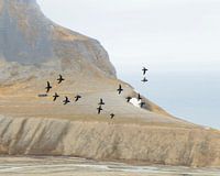 Kleine Alken zijn geweldige, kleine vogeltjes van het hoge noorden. De vogels leven in een kolonie en zijn doorgaans niet zo schuw. In de ochtend klom ik naar boven en genoot ik van grote groepen Kleine Alken die om me heen vlogen. Voor meer foto's van Spitsbergen zie: http://naturebylennart.com/birds-blog/birding-around-longyearbyen/.