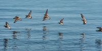 Een vlucht kanoeten weerspiegeld in het water van de Waddenzee nabij Paesens Moddergat. Ze vormen bijna een halve cirkel.