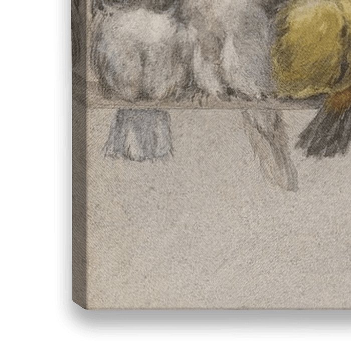 Vierentwintig vinken, variërend in houding en kleur, staan op een rij. Deze aquarel is een variant op een van de meest populaire onderwerpen van de kunstenaar, "Un bâton de cage."
