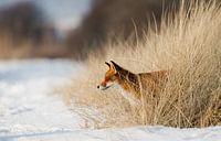 Vos komt vanuit het hoge gras in de winter met een een besneeuwd landschap.