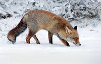 Een vos snuffelend door de vers gevallen sneeuw in de winter.
