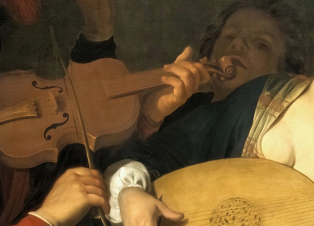 De centrale figuur, een vioolspeler, lijkt helemaal op te gaan in zijn vrolijke deuntje, zijn rossige wangen blozend van de drank of inspanning. Naast hem speelt een luitspeler met vreugdevolle overgave mee, haar hoofd naar achteren gegooid in ongeremde feestvreugde. De overige figuren leunen achterover, klappen, lachen en wiegen op het aanstekelijke ritme, volledig in de ban van de muzikale prestatie.