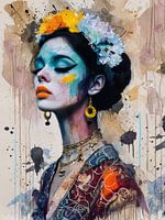Gedetailleerde, levendige schildering van een vrouw met een opvallend, kleurrijk gezicht en traditionele Mexicaans geïnspireerde kleding. De achtergrond is een mix van aquarelspatten in beige, bruin en zwart, wat de afbeelding een abstracte, artistieke uitstraling geeft. De algehele stijl combineert realisme met abstracte elementen, met de nadruk op felle kleuren en texturen. De serene uitdrukking van de vrouw en de complexe details van haar kleding en make-up suggereren een mix van culturele trots en artistieke expressie. De afbeelding is een kunstwerk, gekenmerkt door de levendige kleuren, gedetailleerde texturen en traditionele Mexicaanse motieven.