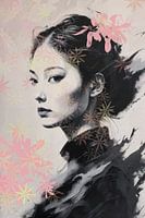 Een contrastrijk,, zwart-wit abstract schilderij, dat een serene vrouwenprofielfoto afbeeldt met een subtiele, raadselachtige glimlach. De algehele esthetiek is stemmig en suggestief, met diepe, rijke schaduwen die delen van het gezicht bedekken en heldere, doordringende highlights die de gelaatstrekken van het model accentueren, De korrelige textuur en het hoge contrast geven het kunstwerk een gevoel van dynamische energie, alsof het op het punt staat tot leven te komen en de kijker mee te slepen met zijn raadselachtige, introspectieve aanwezigheid.