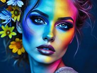 Deze foto toont een betoverend portret van een vrouw omringd door kleuren. De kleuren vormen een prachtig contrast met haar huid en brengen een delicate, bijna dromerige sfeer naar voren. Haar blik is zacht en mysterieus, alsof ze diep in gedachten verzonken is of misschien een geheim bewaart. De combinatie van vrouw en bloemen straalt zowel kracht als kwetsbaarheid uit, en het samenspel van natuurlijke elementen en menselijke expressie maakt dit portret tot een visuele ode aan schoonheid en harmonie met de natuur