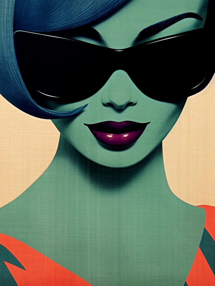 Tussen de oranje rode lijnen zie je een groene glamour vrouw met een zonnebril en blauw haar. Contrasterende kleuren. Popart silkscreening stijl. Dit werkstuk is gemaakt in samenwerking met kunstmatige intelligentie.