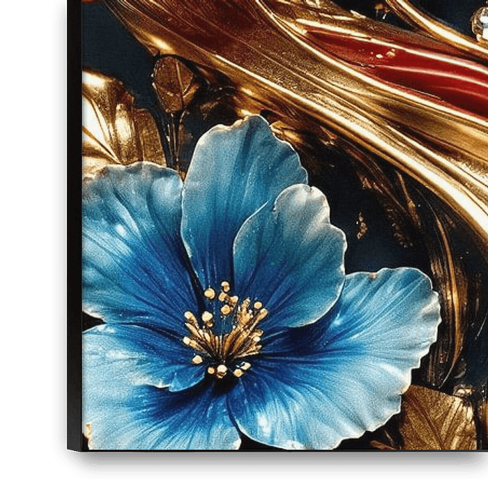 Koop dit bloemen kunstwerk Een vrouwengezicht als van albast - Een sensuele rode mond omlijst door gloeiende bloemen, goud en rood marmer van AidasignArt op canvas, aluminium dibond, (ingelijste) fotoprint, behang en ArtFrame, op maat geprint in Fine-Art kwaliteit.