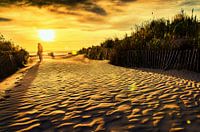 Een wandelaar in de duinen van Le grau du roi in het zuiden van Frankrijk bij zonsondergang