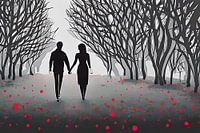 "Illustratie - Een wandeling door het park" is een verhalend kunstwerk dat de herfst en de liefde viert. In deze illustratie zien we een koppel dat hand in hand door het park loopt. De herfstbladeren in rood liggen verspreid over de grond, waardoor een warme en sfeervolle setting ontstaat.