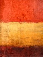 Een helder rood domineert het bovenste deel van de foto en gaat over in een warme gouden tint voordat het overgaat in een diep, aards rood aan de onderkant. De kleuren hebben een structuureffect en doen denken aan een verweerd oppervlak, wat extra diepte geeft aan de eenvoudige maar indrukwekkende kleurgradatie.