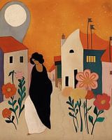 Naïeve kunst: een weergave van een vrouw op een warme zomeravond in een mediterrane / oosterse setting. Een bijzonder en kleurrijk werk voor aan je muur!