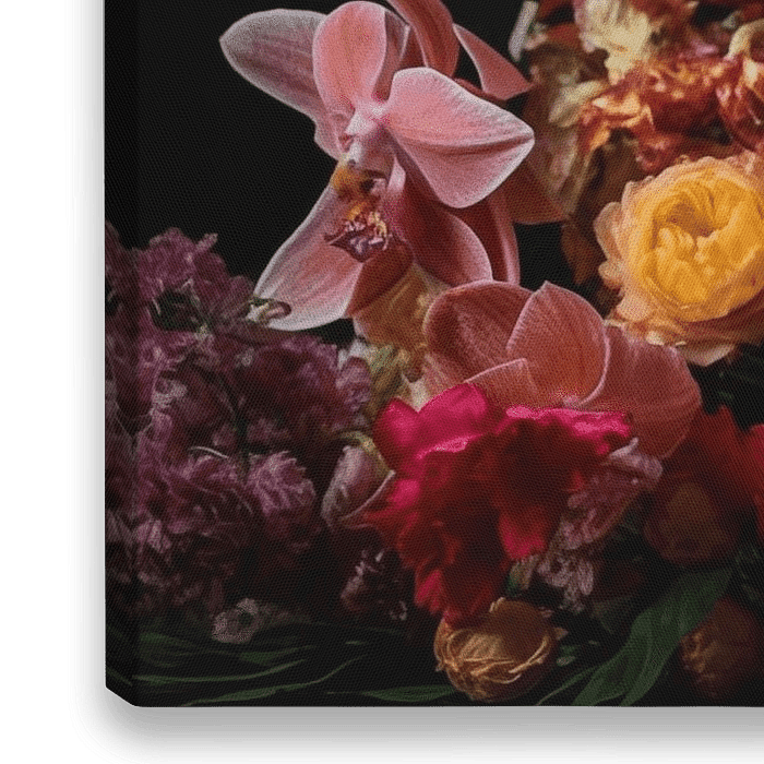 Een weelderige en uitbundig arrangement van orchideeën en wilde bloesems: bloemen zijn in art-nouveaustijl; ze stralen levendigheid en schoonheid uit. De bloemen zijn voornamelijk in gouden, okergele, karmijnrode, violette en gedempte roze tinten.