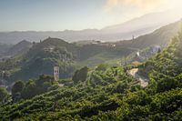 The image showcases a sweeping view of the terraced slopes, with a winding road gently weaving through the lush green vines. Bathed in the soft, golden light of the late afternoon,…