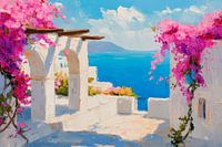 Een harmonieus samenspel van felblauw en levendig roze ontvouwt zich, terwijl bougainville in volle bloei de schaduwrijke paden siert. De witte muren weerspiegelen het zonlicht en nodigen je uit voor een wandeling langs de kust, waar de oceaan de kust zachtjes omarmt. Een plek die staat voor dromen en ontspanning.