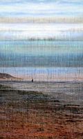 Samen een schilderachtige landschappelijk sfeerbeeld in de natuurlijke pasteltinten van zand, water en lucht. Een gelaagd abstract sferisch landschap, gevangen in horizontale vlakken en zinderende verticale lijnen.