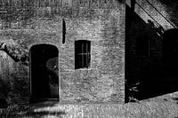 Een werf aan de Nieuwegracht in Utrecht in het ochtendlicht (zwartwit). Het ochtendlicht stijkt over de Nieuwegracht in Utrecht en licht de werfkelders warm aan op deze mooie zomerochtend van 8 augustus 2024.