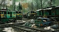 Een spoorwegkerkhof, rottende wagons, locomotieven, hele treinen, een vrachtwagen in de sneeuw