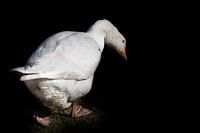 Een witte gans loopt voor een donkere achtergrond in het open op een droge weide