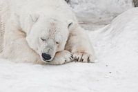 Een witte ijsbeer (witte beer) in een pluizige kristalwitte huid die op de sneeuw ligt en slaapt (rust), een groot roofdier (verstoppen, samenvoegen) onmerkbaar op witte sneeuw van dichtbij.