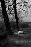 Een witte kei dit ligt bij twee bomen in een ongerept landschap.