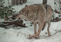 Een wolf (vrouwelijke wolf) snauwt om zijn prooivlees te beschermen. Een wolf in de sneeuw in een winterbos is een krachtig roofdier.