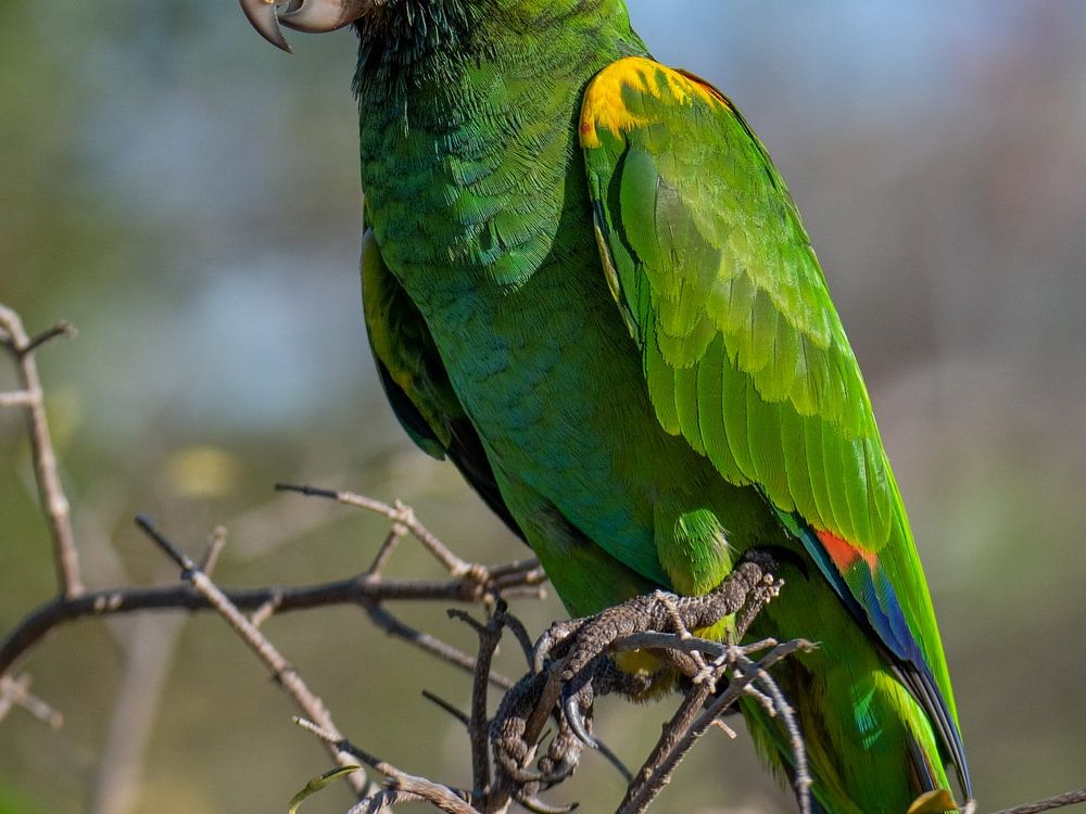 De vogel is 33 cm lang en overwegend groen gekleurd. Kenmerken zijn de smalle donkergroene randen om de veren, waardoor het lijkt of de vogel geschubd is. Het groen van de borst en buik heeft een blauwachtige tint. Het groen op de kop gaat geleidelijk over in geel op het voorhoofd en rond het oog. Onder het oog gaat het geel via lichtblauw over op groen. Verder zitten er gele vlekken op de schouder en het bevederde deel van het loopbeen. In vlucht is de rode spiegel zichtbaar op de vleugel en zijn de donkerblauwe uiteinden van de vleugelveren te zien.