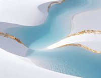 Een digitaal landschap met een zachte, sneeuwwitte golving, geaccentueerd door gouden randen, afgewisseld met gletsjerblauwe waterpartijen. Een minimalistisch landschap dat doet denken aan bewaard gebleven frisheid en zuiverheid, verstoken van enige menselijke afdruk.