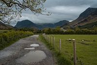 Zandweg tussen grasvelden leidend naar het Buttermere meer in Cumbria, Engeland. Schapen grazen op de grasvelden rechts