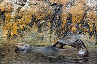 Nieuw-Zeelandse pelsrob liggend op zijn rug in de Doubtful Sounds in Nieuw Zeeland