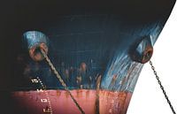 De harde details op de boeg. De kluisgaten met een roestige rand. De ankerkettingen strak gespannen. De ijkmerken bakboord en stuurboord. De grote en hoge boeg van de bulkcarrier in de kleuren rood zwart en wit. De lassen van de huidplaten van het schip zijn duidelijk te zien. Dit is een harde…