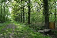 Zicht in het natuurgebied Schelfheide te Nieuwerkerken, Limburg in de lente met op de voorgrond een houten brugje en een houten deurtje. Achter het hek bevinden zich bijenkorven (niet op de foto).