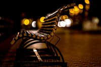 Een zitbank op de zeedijk van Oostende bij nacht , de stadslichten op de zachte achtergrond brengen het geheel tot leven .
