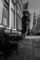 Een stoeltje van metaal en een rond metalen tafeltje allebei in antiekgroen uitgevoerd staan voor een woning in de Bloemstraat, met zicht op de Westertoren. Dit werk is zowel in kleur als in zwartwit te bestellen.