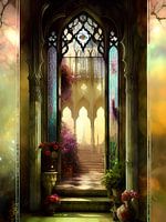 Interieur van een fantasie paleis, dat doet denken aan de verhalen van 1001 nacht of de Daevabad trilogie. Een uitnodigende wereld vol prachtige architectuur in Arabische stijl versierd met bloemen. Een koele oase in de woestijn.