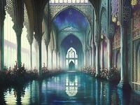 Interieur van een fantasie paleis, dat doet denken aan de verhalen van 1001 nacht of de Daevabad trilogie. Een uitnodigende wereld vol prachtige architectuur in Arabische stijl versierd met bloemen. Neem een duik in deze koele oase in de woestijn.