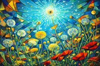 Een levendige scène die een abstracte tuin met paardenbloemen en klaprozen afbeeldt. De lucht straalt in schitterende blauwe tinten en verspreidt het licht over de flora.