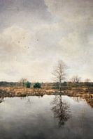 Op de voorgrond ligt een stil meer, waarin de boom aan de oever zichzelf zacht weerspiegelt. Het landschap ademt een rustige poëzie, alsof de tijd even stilstaat.