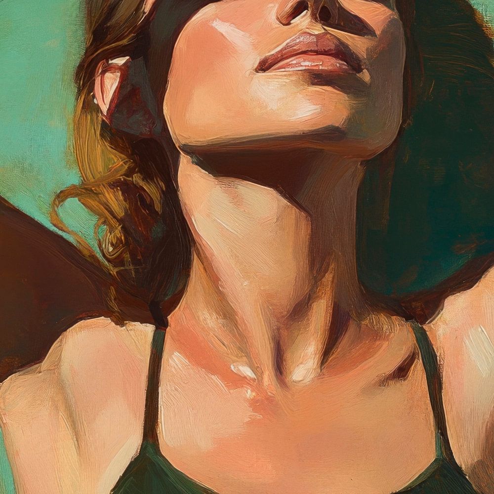 Met een speelse uitdrukking en gesloten ogen geniet ze van de warme zonnestralen terwijl de zachte schaduwen haar gezicht strelen. Het contrast tussen het diepe groen van het oppervlak en haar gebruinde teint creëert een harmonieuze sfeer van ontspanning en vrijheid. Elegant en zelfverzekerd belichaamt ze pure luchthartigheid.