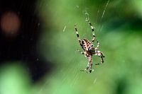 Ik heb deze foto van een spinnetje gemaakt in de achtertuin waar nog meer spinnen zaten. Ik weet niet om wat voor een pin het gaat, ik vond het wel de moeite waart om een foto van deze kleine spin te maken In de achtergrond zie je het groen van een struik waar een deel van de web aan vast zit, als je goed kijkt zie je een beetje van het web waar de spin op zit. Zoals je kan zien scheen de zon toen ik deze foto maakte. Ondanks dat ik een macrolens op mijn camera had is het geen macrofoto mar een close-up foto.