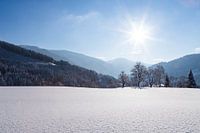 De foto is genomen op een mooie winterdag in de Oostenrijkse Alpen. Op de foto is een besneeuwd veld te zien met op de achtergrond een paar bomen en bergen onder een stralende zon.