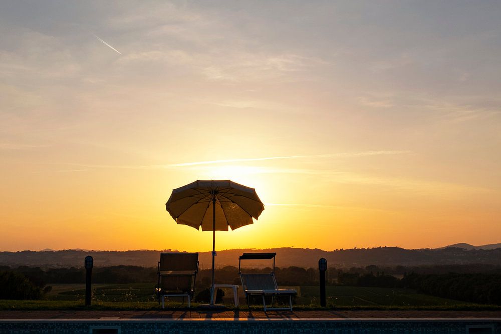 Een zonsondergang met zwembad en blauw water in, Toscane, Italië.