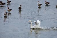 Deze foto van een zwaan in actie heb ik gemaakt in de natuurgebied Harderbroek in de gemeente Zeewolde nabij Harderwijk. In de buurt van deze zwaan zwom zijn/haar jong die hij/zij verdedigt. Zoals je aan de ganzen ziet was het water op een aantal plekken redelijk ondiep. De zwaan op de foto is een knobbelzwaan die in de Harderbroek…