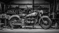 Een zwart-witfoto van een oude motor in de hangar