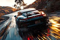 Een zwarte Porsche 911 GT3 straalt pure kracht en elegantie uit. De diepzwarte lak glanst in het licht en benadrukt de vloeiende lijnen en aerodynamische vorm van de sportwagen. Zijn brede wielkasten en opvallende achterspoiler geven de auto een agressieve uitstraling, terwijl het interieur luxe en sportiviteit combineert. Met zijn bulderende motor en scherpe, precieze besturing is de zwarte Porsche 911 GT3 een perfecte samensmelting van snelheid, stijl en prestaties, een icoon op zowel de weg als het circuit.