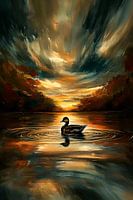 Een prachtig kunstwerk waarin een serene eend op een rustige waterplas drijft, omringd door een dramatische zonsondergang. De warme kleuren van de hemel, gecombineerd met het kalme water, creëren een rustgevende sfeer. Perfect voor liefhebbers van natuur en kunst.