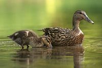 Moeder wilde eend met een van haar kuikens. Ze houdt de omgeving nauwlettend in de gaten.